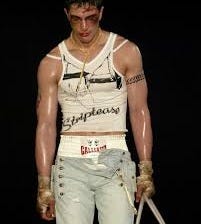 A subtheme commonly discussed in the show is its clear parallels to the movie Fight Club (1999, Dir. David Fincher), a social satire on rigid and ironic structures of masculinity. In this runway, Galliano challenges masculinity on both sides of the spectrum, exploring “the dark side of masculinity”, reflecting on expectations of what a man is supposed to wear, constantly bridging the line of romanticism and brutality in menswear. The opposites forces the audience to observe masculine-dress from multiple angles, making us wonder “what truly defines what we value as a society in a man’s appearance, do we want them to be polished, feminine, prince-like or to be rustic, dirty, dangerous…”